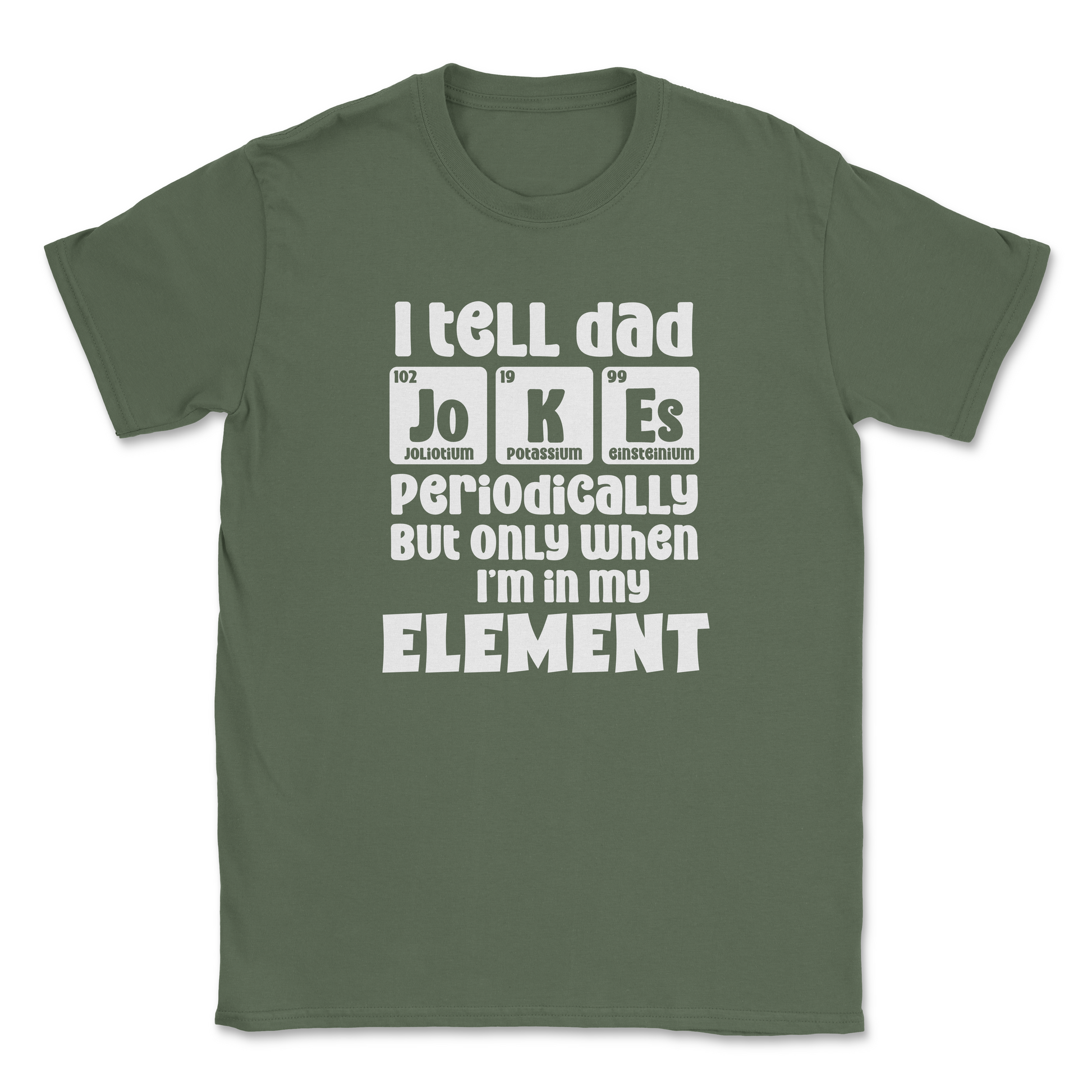 Show off your dad humor with our "I TELL DAD JOKES PERIODICALLY, BUT ONLY WHEN I AM IN MY ELEMENT" Graphic T-Shirt — perfect for everyday wear, gifting, or adding a fun statement to your outfit.